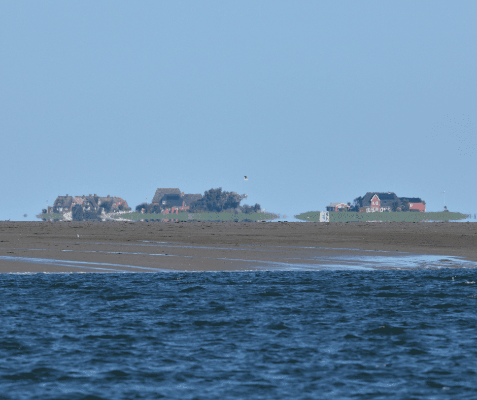 In the Wadden Sea, off the coast of North Frisia, lies a group of small, unique islands known as the Halligen. Unlike most islands, the Halligen are not protected by dikes and are regularly flooded by the sea, creating a surreal landscape where only the tops of houses, built on man-made mounds, remain visible.