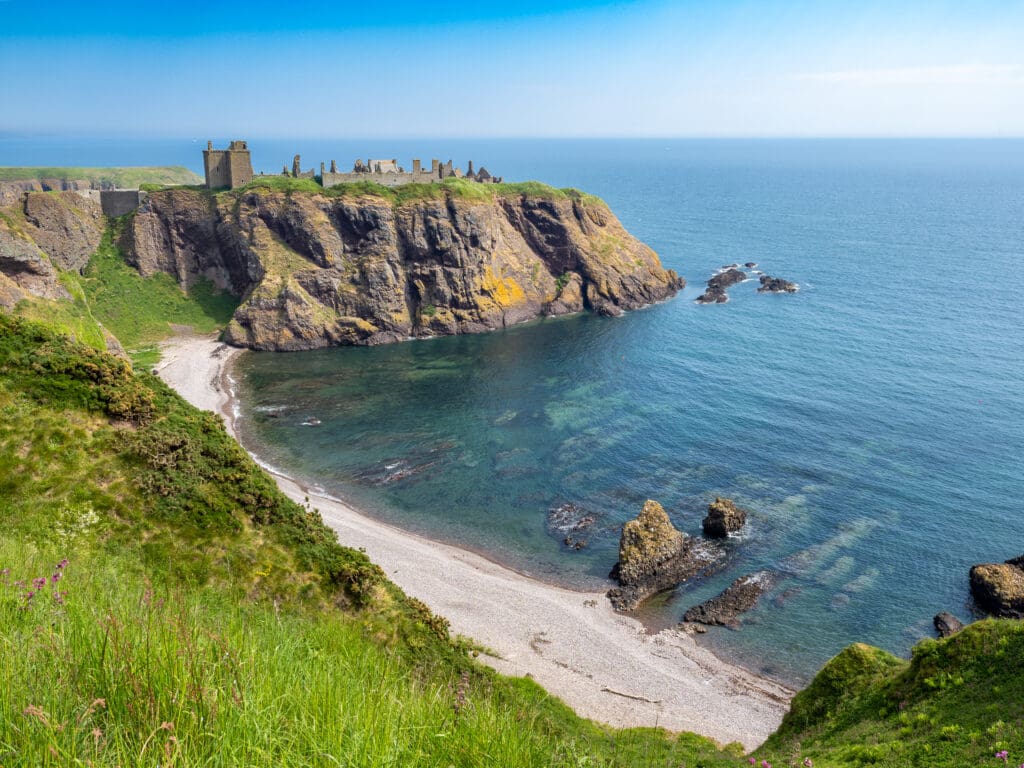 Dunnottar Castle Coastal Path (1 mile, easy-moderate) runs along dramatic cliffs to one of Scotland’s most photogenic castle ruins. The medieval fortress sits on a rocky headland, surrounded by crashing waves and wheeling seabirds. It’s a short walk but delivers outsized visual impact.