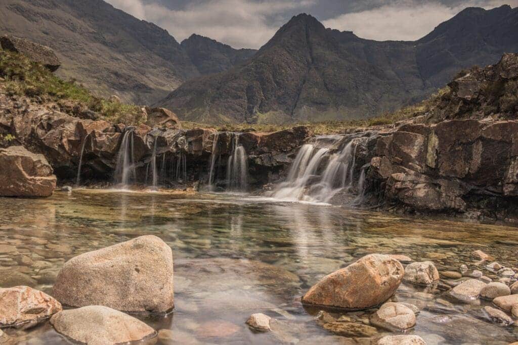 Fairy Pools (2.5 miles, easy) might be Skye’s most photographed walk, and for good reason. The trail follows a series of crystal-clear pools and waterfalls beneath the Black Cuillin mountains. The last time I visited, it was typical Scottish weather, misting and unpredictable, but that didn’t stop me. A few fellow travelers and I decided to take the plunge and swim in the refreshing waters of the Fairy Pools. According to legend, swimming in these mystical waters is said to grant good luck, bravery, or inspiration, with some believing the pools are a gateway to the fairy realm.