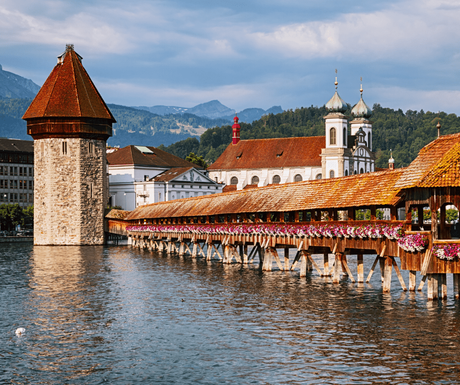 The Chapel Bridge is Lucerne’s most iconic landmark. This 14th-century wooden bridge spans the Reuss River and is adorned with a series of 17th-century paintings depicting the history of Lucerne. The adjacent Water Tower, once used as a prison and a treasury, adds to the historical charm of the site.